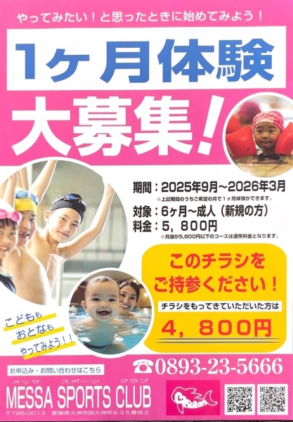おかげさまで1か月体験をたくさんの方がご利用していただきありがとうございます!申し込みわすれてたΣ(゚д゚lll)ガーン間に合わなかった(´;ω;`)ウッ…そんな方!!だいじょうぶです(^_-)-☆9月・10月も引き続き1か月体験を実施します!!!冬に向かって免疫力高めませんか♪水泳や運動は身体にも心にも良いことたくさん\(^o^)/